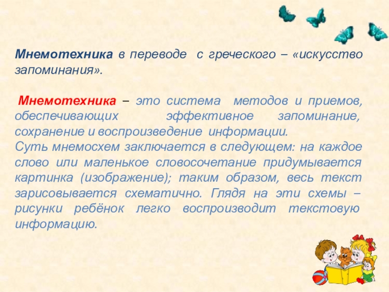 Мнемотехника – это система методов и приемов, обеспечивающих эффективное запоминание, сохранение и воспроизведение информации.