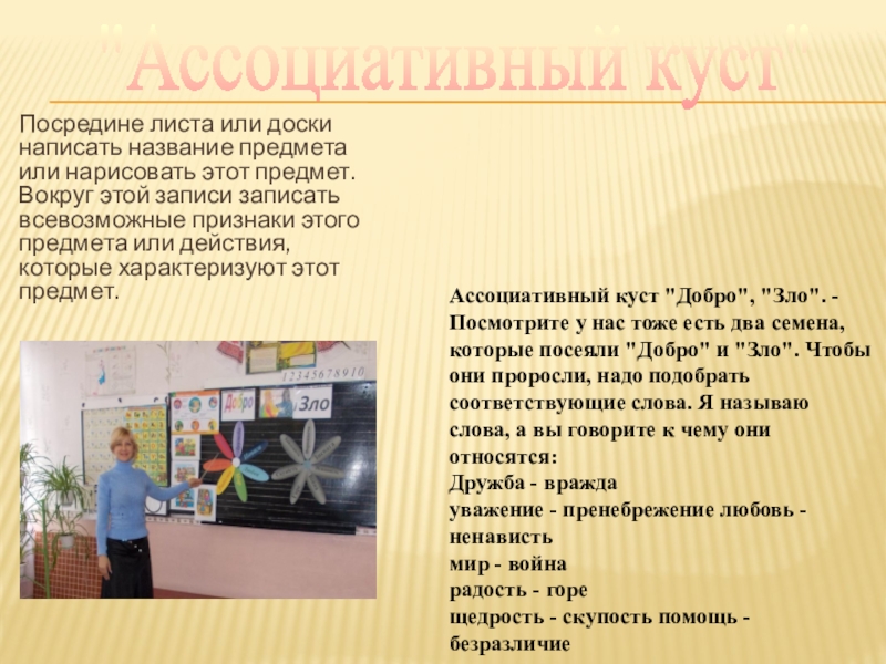 Ассоциативный куст "Добро", "Зло". - Посмотрите у нас тоже есть два семена, которые посеяли "Добро" и "Зло". Чтобы они проросли, надо подобрать соответствующие слова. Я называю слова, а вы говорите к чему они относятся: