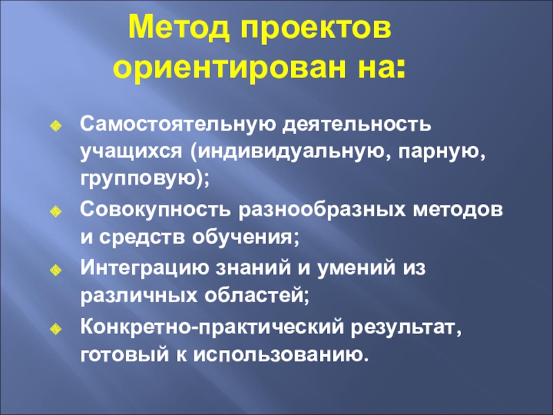Метод проектов ориентирован на:Самостоятельную деятельность учащихся (индивидуальную, парную, групповую);Совокупность разнообразных методов и средств обучения;Интеграцию знаний и умений