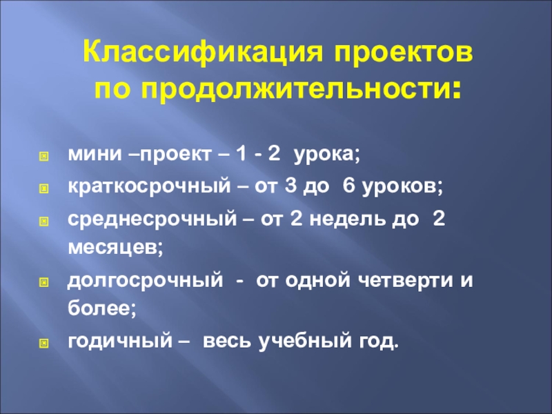 Классификация проектов по продолжительности:мини –проект – 1 - 2 урока;краткосрочный – от 3 до 6 уроков;среднесрочный –