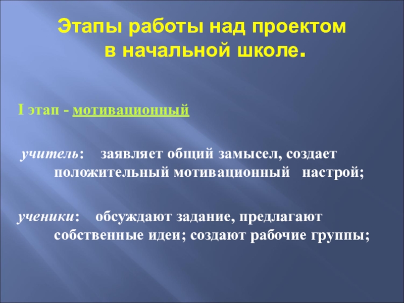 Этапы работы над проектом  в начальной школе.I этап - мотивационный учитель:  заявляет общий замысел, создает