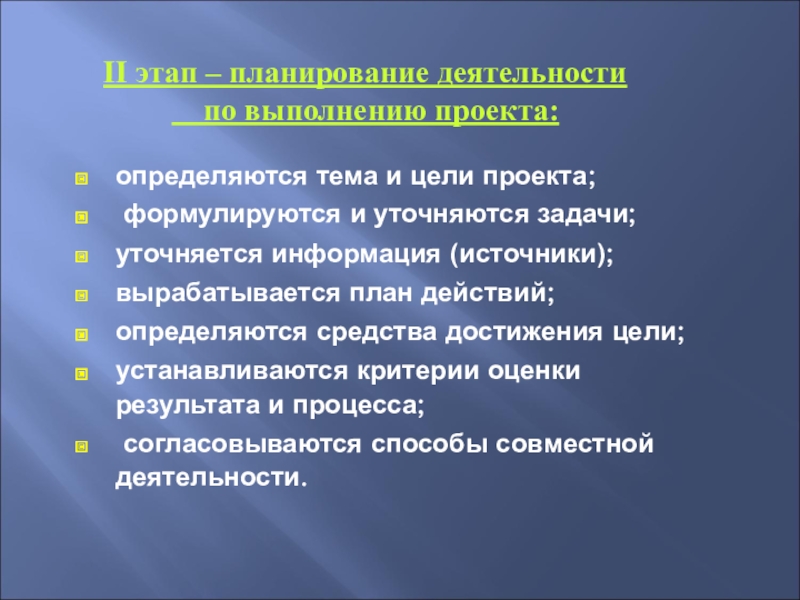 Слайд 11II этап – планирование деятельности по выполнению проекта:
