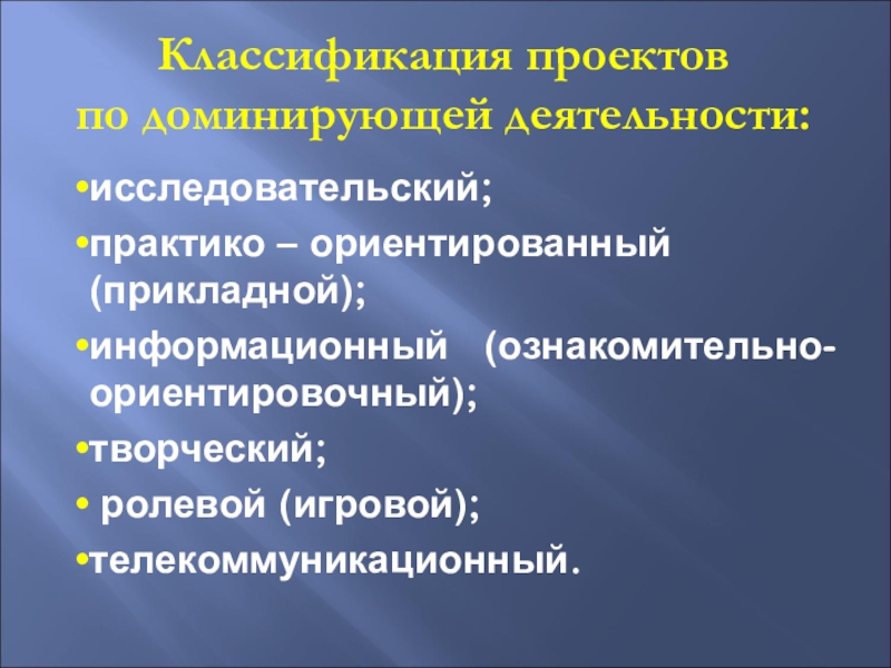 Классификация проектов по доминирующей деятельности:исследовательский;практико – ориентированный (прикладной);информационный  (ознакомительно- ориентировочный); творческий; ролевой (игровой);телекоммуникационный.