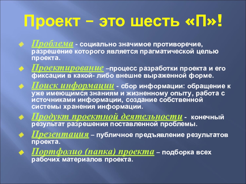 Проект – это шесть «П»!Проблема - социально значимое противоречие, разрешение которого является прагматической целью проекта.Проектирование –процесс разработки