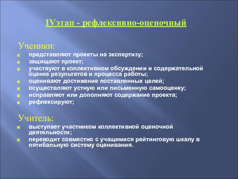 IVэтап - рефлексивно-оценочныйУченики:представляют проекты на экспертизу;защищают проект;участвуют в коллективном обсуждении и содержательной оценке результатов и процесса работы;оценивают
