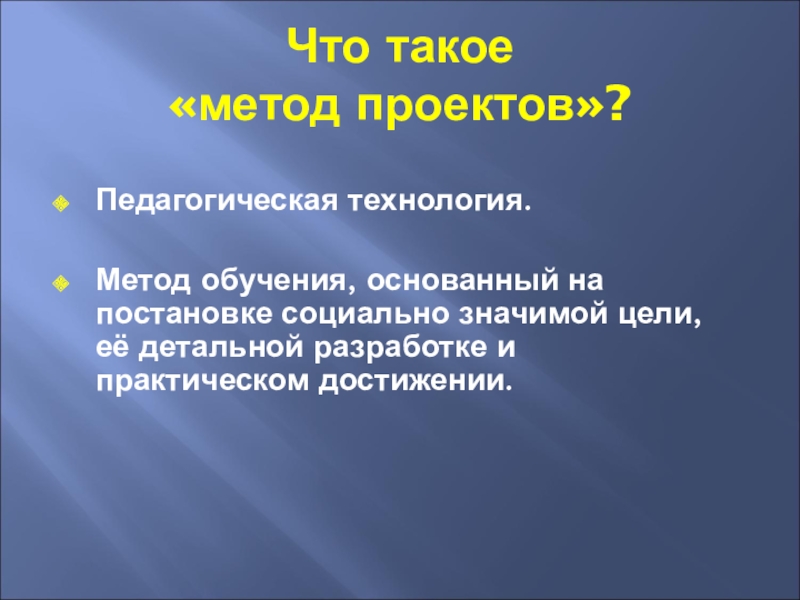 Что такое «метод проектов»?Педагогическая технология.Метод обучения, основанный на постановке социально значимой цели, её детальной разработке и практическом достижении.