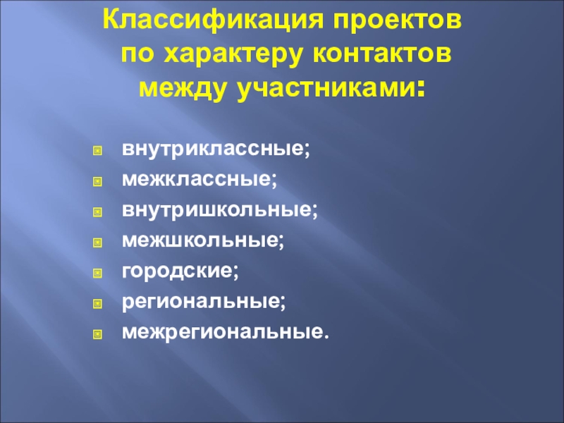 Классификация проектов  по характеру контактов  между участниками:внутриклассные;межклассные;внутришкольные;межшкольные; городские;региональные;межрегиональные.