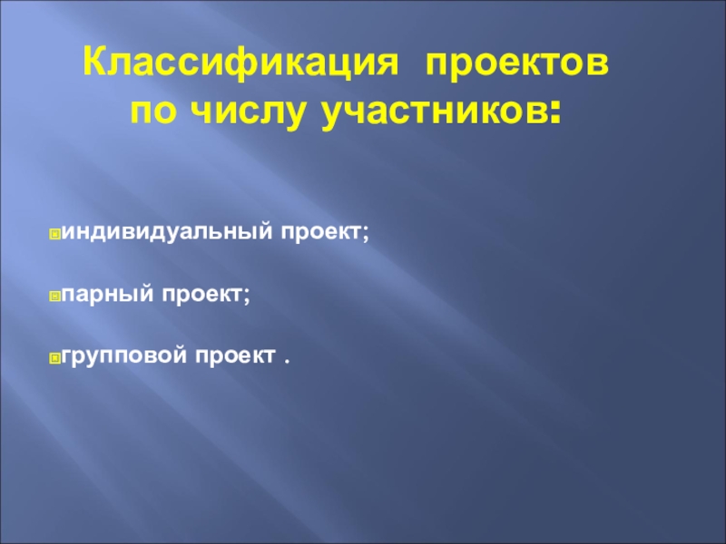 Классификация проектов  по числу участников:индивидуальный проект; парный проект;групповой проект .