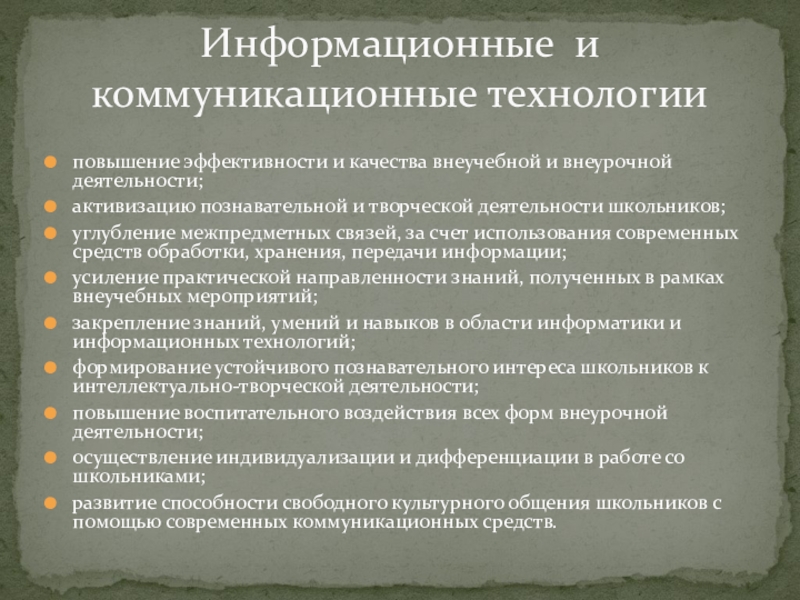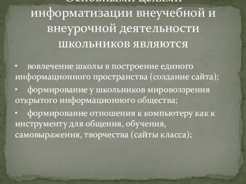 Основными целями информатизации внеучебной и внеурочной деятельности школьников являются
