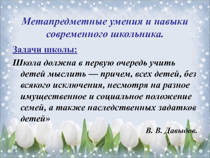 Это сайт презентаций, где можно хранить и обмениваться своими презентациями, докладами, проектами, шаблонами в формате PowerPoint с другими пользователями. Мы помогаем школьникам, студентам, учителям, преподавателям хранить и обмениваться учебными материалами.