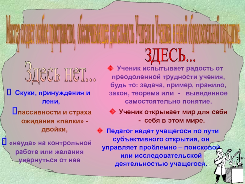 Педагог ведет учащегося по пути субъективного открытия, он управляет проблемно – поисковой или исследовательской деятельностью учащегося.