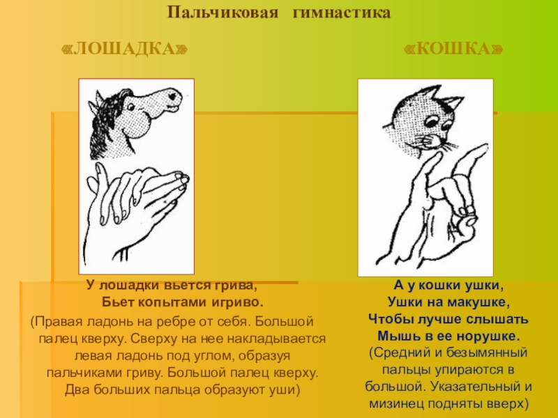 (Правая ладонь на ребре от себя. Большой палец кверху. Сверху на нее накладывается левая ладонь под углом, образуя пальчиками гриву. Большой палец кверху. Два больших пальца образуют уши)