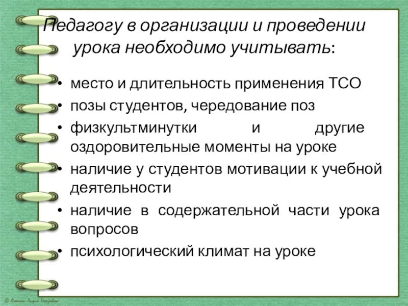 Педагогу в организации и проведении урока необходимо учитывать:место и длительность применения ТСО позы студентов, чередование позфизкультминутки и