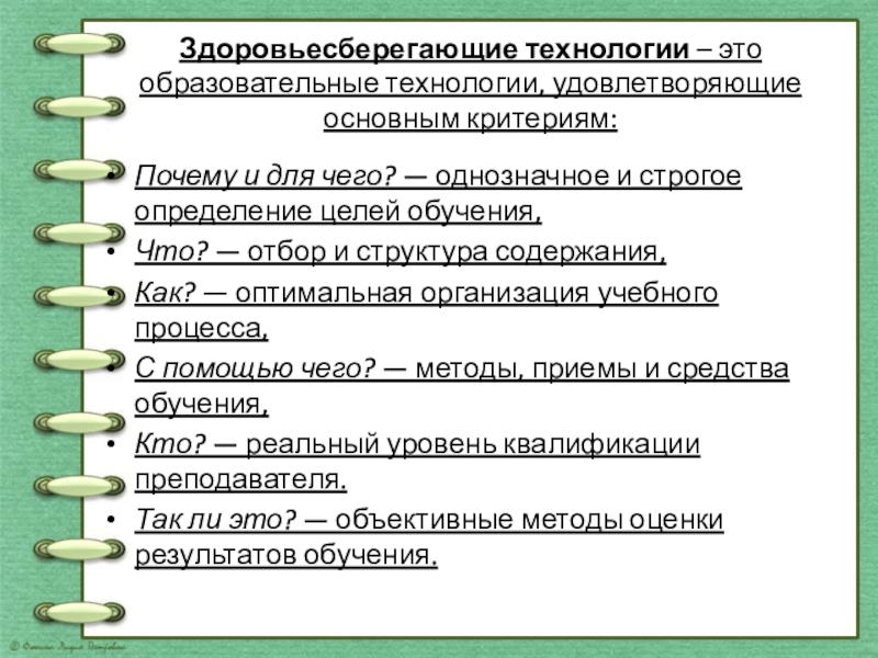 Здоровьесберегающие технологии – это образовательные технологии, удовлетворяющие основным критериям:Почему и для чего? — однозначное и строгое определение целей обучения,Что? — отбор и структура содержания,Как? — оптимальная организация учебного процесса,С помощью чего? — методы, приемы и средства обучения,Кто? — реальный уровень квалификации преподавателя.Так