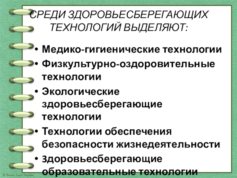 СРЕДИ ЗДОРОВЬЕСБЕРЕГАЮЩИХ ТЕХНОЛОГИЙ ВЫДЕЛЯЮТ:Медико-гигиенические технологииФизкультурно-оздоровительные технологииЭкологические здоровьесберегающие технологииТехнологии обеспечения безопасности жизнедеятельности 3доровьесберегающие образовательные технологии