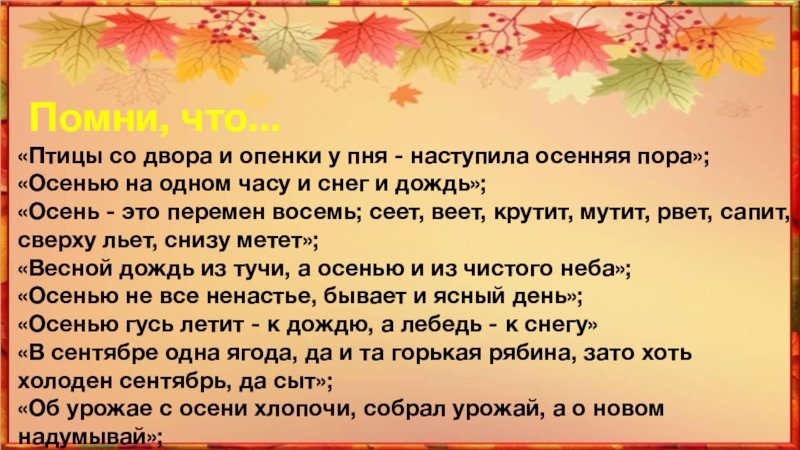 «Осень - это перемен восемь; сеет, веет, крутит, мутит, рвет, сапит, сверху льет, снизу метет»;