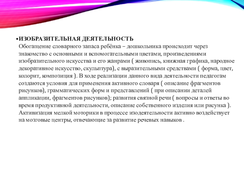 основными и вспомогательными цветами, произведениями изобразительного искусства и его жанрами ( живопись, книжная графика, народное декоративное искусство, скульптура), с выразительными средствами ( форма, цвет, колорит, композиция ). В ходе реализации данного вида деятельности педагогам создаются условия для применения активного словаря ( описание фрагментов рисунков), грамматических форм и представлений ( при описании деталей аппликации, фрагментов рисунков); развития связной речи ( вопросы и ответы во время продуктивной деятельности, описание собственного изделия или рисунка ).