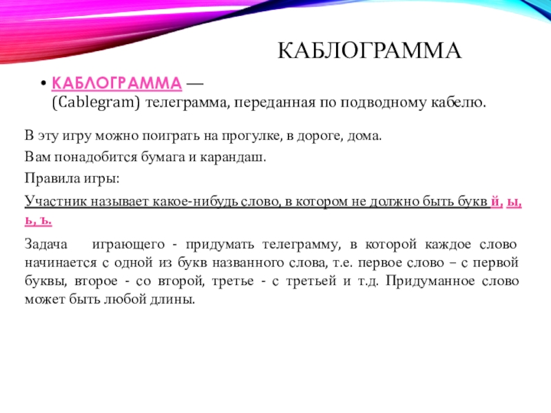 Задача играющего - придумать телеграмму, в которой каждое слово начинается с одной из букв названного слова, т.е. первое слово – с первой буквы, второе - со второй, третье - с третьей и т.д. Придуманное слово может быть любой длины.