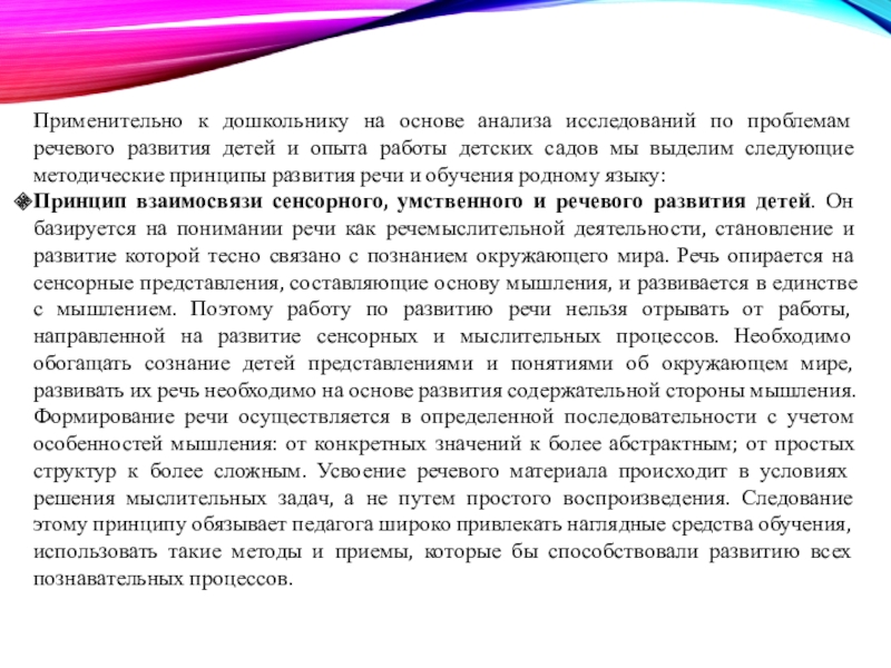 Принцип взаимосвязи сенсорного, умственного и речевого развития детей. Он базируется на понимании речи как речемыслительной деятельности, становление и развитие которой тесно связано с познанием окружающего мира. Речь опирается на сенсорные представления, составляющие основу мышления, и развивается в единстве с мышлением. Поэтому работу по развитию речи нельзя отрывать от работы, направленной на развитие сенсорных и мыслительных процессов. Необходимо обогащать сознание детей представлениями и понятиями об окружающем мире, развивать их речь необходимо на основе развития содержательной стороны мышления. Формирование речи осуществляется в определенной последовательности с учетом особенностей мышления: от конкретных значений к более абстрактным; от простых структур к более сложным. Усвоение речевого материала происходит в условиях решения мыслительных задач, а не путем простого воспроизведения. Следование этому принципу обязывает педагога широко привлекать наглядные средства обучения, использовать такие методы и приемы, которые бы способствовали развитию всех познавательных процессов.