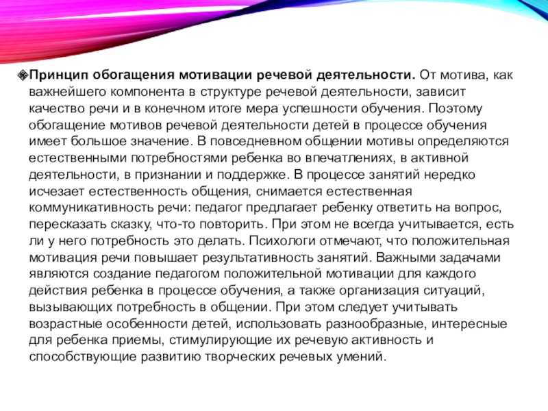 Слайд 11Принцип обогащения мотивации речевой деятельности. От мотива, как важнейшего компонента в