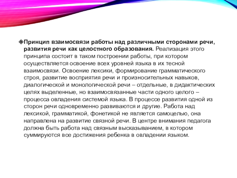 Слайд 10Принцип взаимосвязи работы над различными сторонами речи, развития речи как целостного