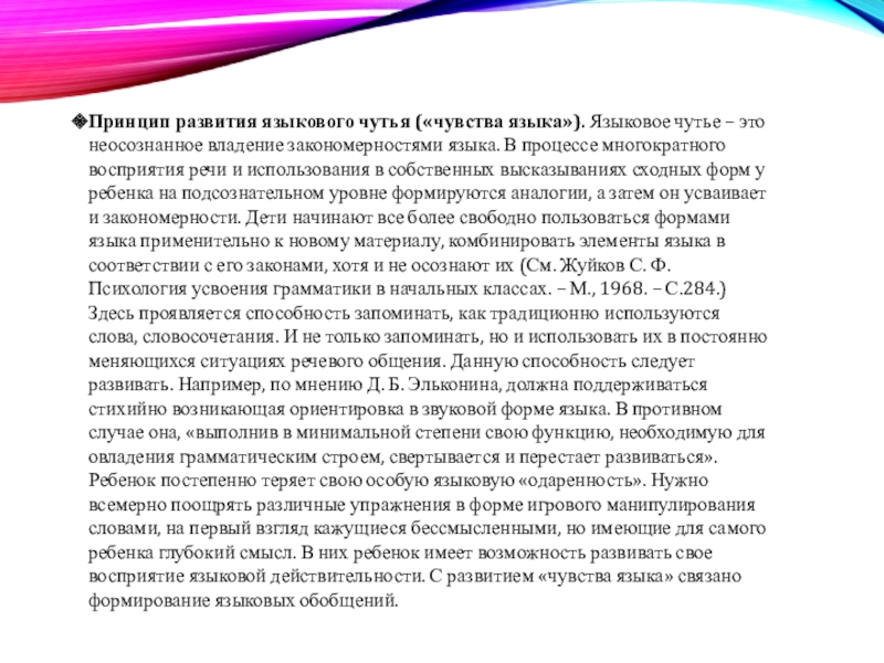 Слайд 8Принцип развития языкового чутья («чувства языка»). Языковое чутье – это неосознанное