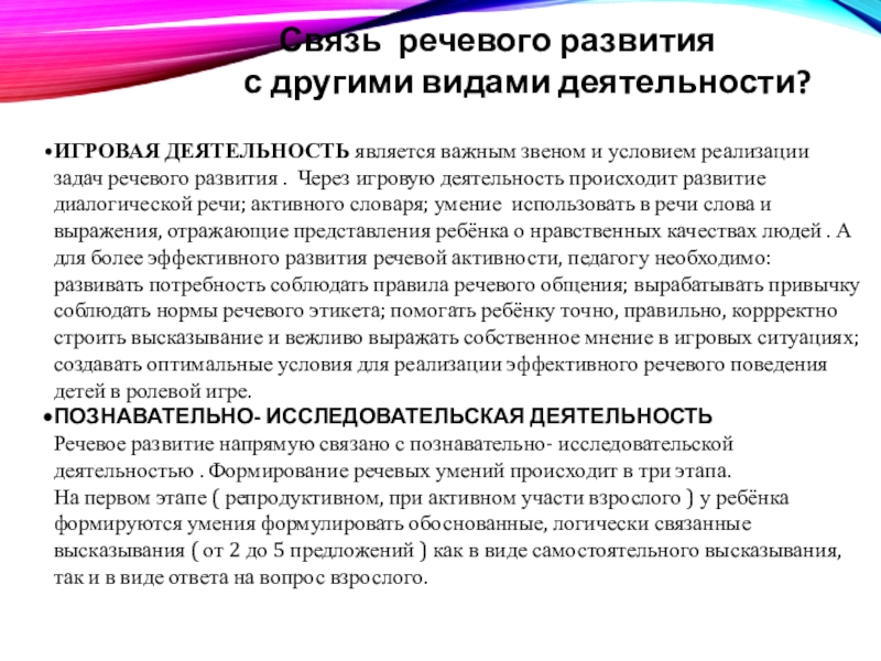 ИГРОВАЯ ДЕЯТЕЛЬНОСТЬ является важным звеном и условием реализации задач речевого развития . Через игровую деятельность происходит развитие диалогической речи; активного словаря; умение использовать в речи слова и выражения, отражающие представления ребёнка о нравственных качествах людей . А для более эффективного развития речевой активности, педагогу необходимо: развивать потребность соблюдать правила речевого общения; вырабатывать привычку соблюдать нормы речевого этикета; помогать ребёнку точно, правильно, коррректно строить высказывание и вежливо выражать собственное мнение в игровых ситуациях; создавать оптимальные условия для реализации эффективного речевого поведения детей в ролевой игре.