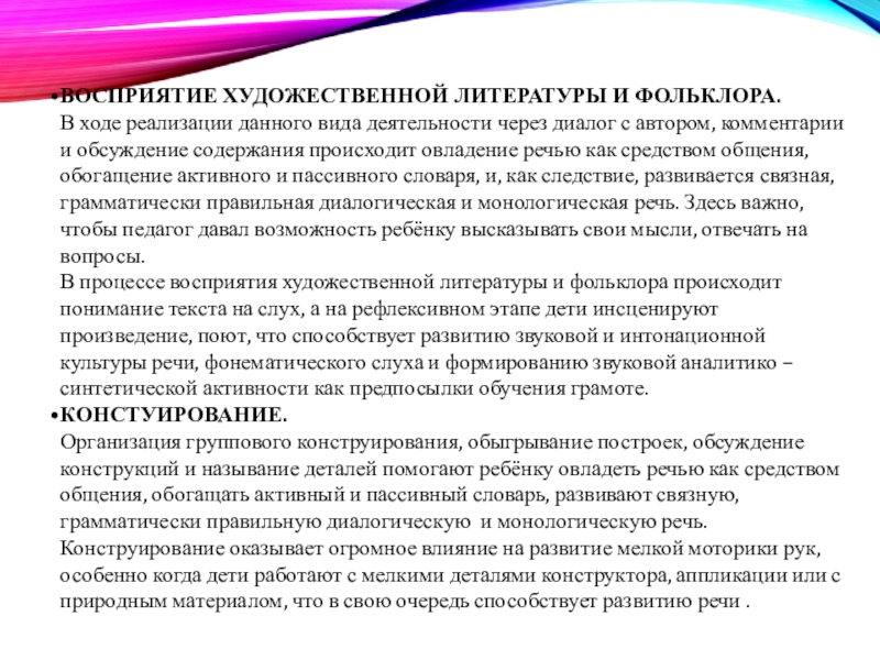 В процессе восприятия художественной литературы и фольклора происходит понимание текста на слух, а на рефлексивном этапе дети инсценируют произведение, поют, что способствует развитию звуковой и интонационной культуры речи, фонематического слуха и формированию звуковой аналитико – синтетической активности как предпосылки обучения грамоте.