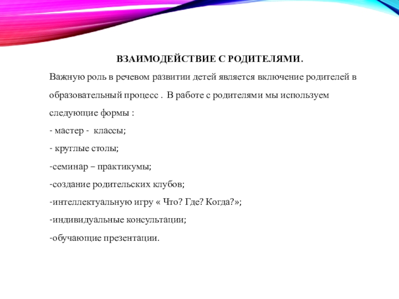 Слайд 22ВЗАИМОДЕЙСТВИЕ С РОДИТЕЛЯМИ.