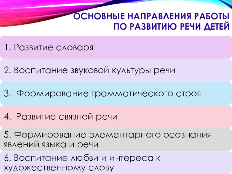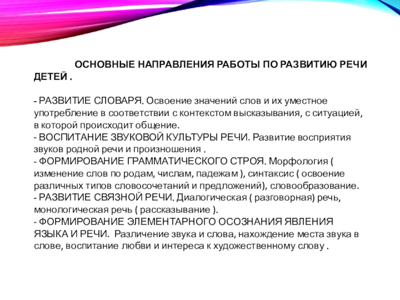 3. Развитие связной, грамматически правильной диалогической и монологической речи. Связная речь состоит из диалога и монолога. Строительным материалом для неё является словарь и освоение грамматического строя речи, т.е. умение изменять слова, соединять их в предложения.