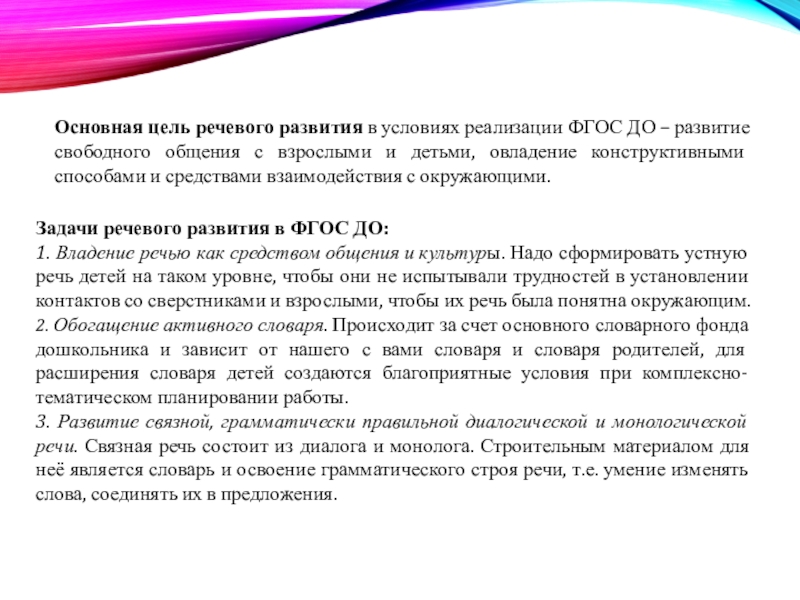 Слайд 4Основная цель речевого развития в условиях реализации ФГОС ДО – развитие свободного общения