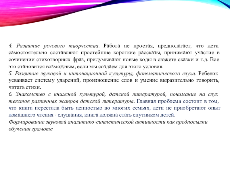 6. Знакомство с книжной культурой, детской литературой, понимание на слух текстов различных жанров детской литературы. Главная проблема состоит в том, что книга перестала быть ценностью во многих семьях, дети не приобретают опыт домашнего чтения - слушания, книга должна стать спутником детей.