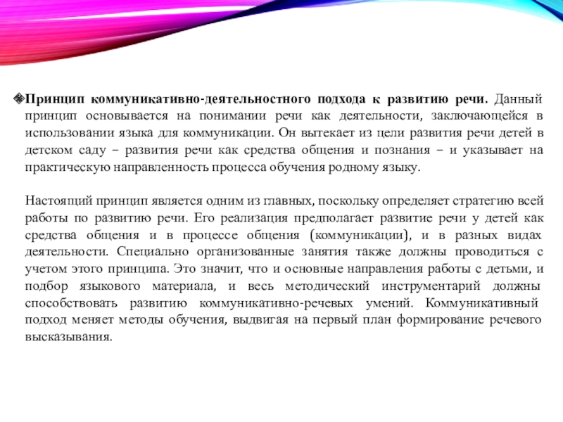 Слайд 7Принцип коммуникативно-деятельностного подхода к развитию речи. Данный принцип основывается на понимании