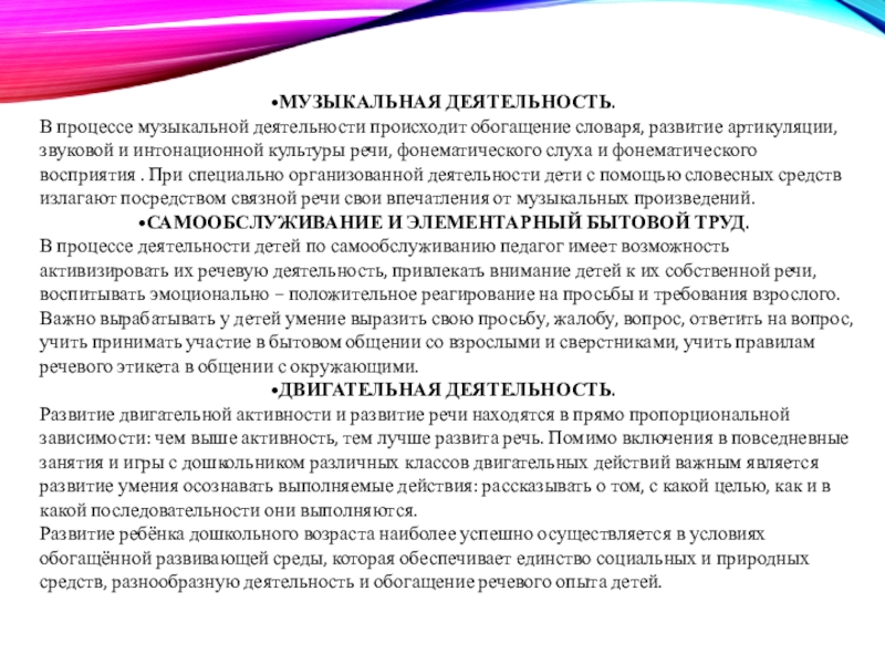 В процессе музыкальной деятельности происходит обогащение словаря, развитие артикуляции, звуковой
