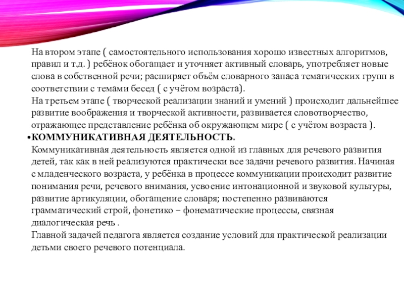 Коммуникативная деятельность является одной из главных для речевого развития детей, так как в ней реализуются практически все задачи речевого развития. Начиная с младенческого возраста, у ребёнка в процессе коммуникации происходит развитие понимания речи, речевого внимания, усвоение интонационной и звуковой культуры, развитие артикуляции, обогащение словаря; постепенно развиваются грамматический строй, фонетико – фонематические процессы, связная диалогическая речь .