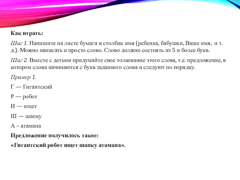 Шаг 2. Вместе с детьми придумайте свое толкование этого слова, т.е. предложение, в котором слова начинаются с букв заданного слова и следуют по порядку.