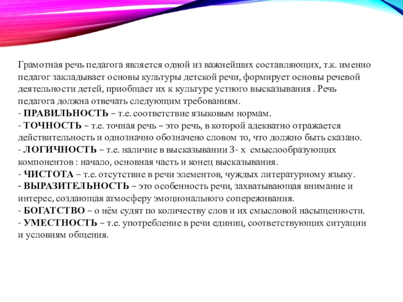 Слайд 23Грамотная речь педагога является одной из важнейших составляющих, т.к. именно педагог