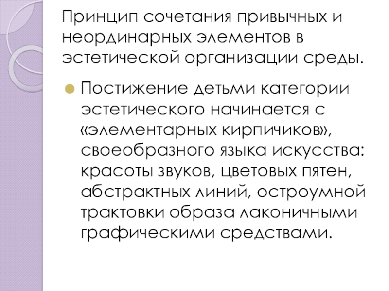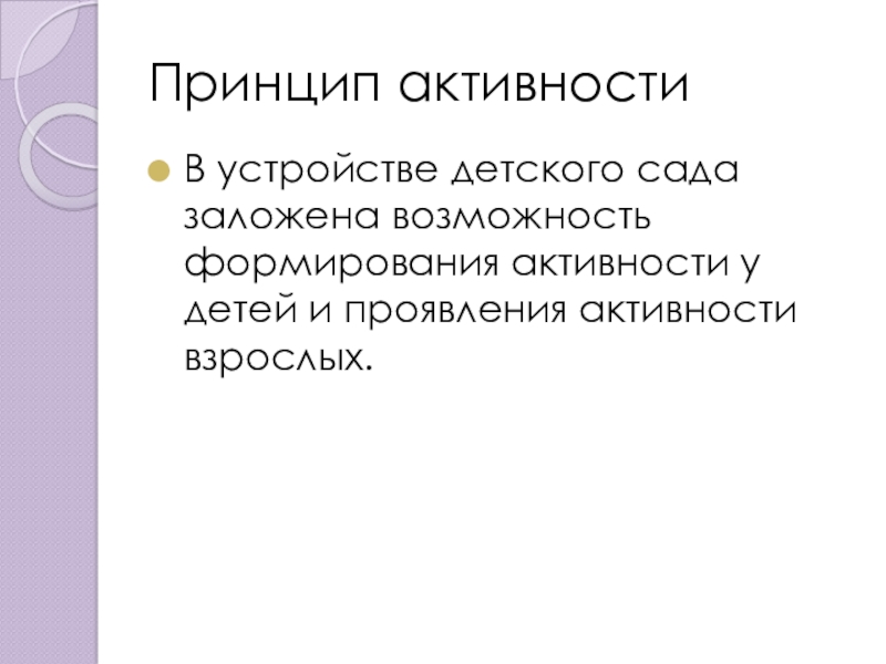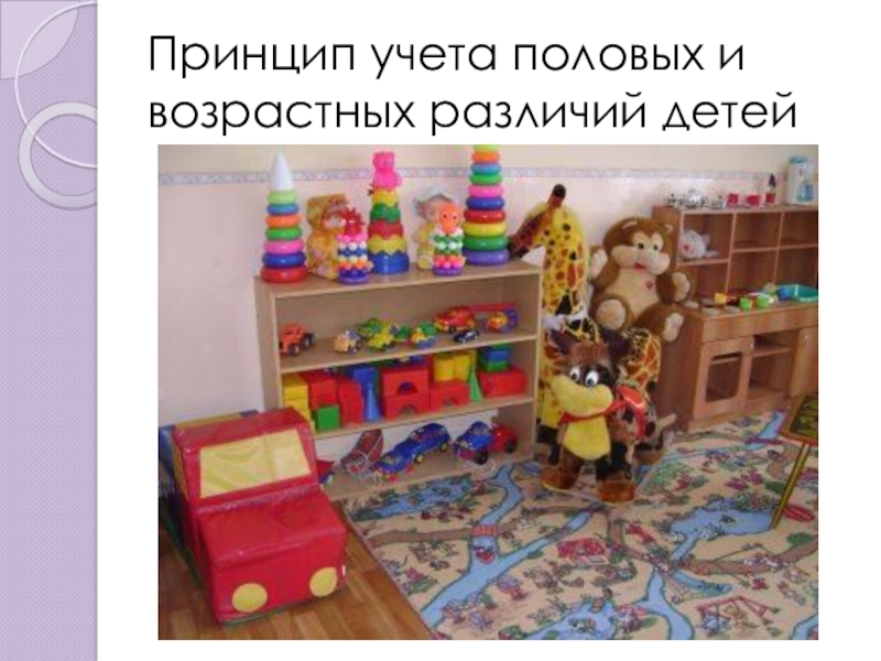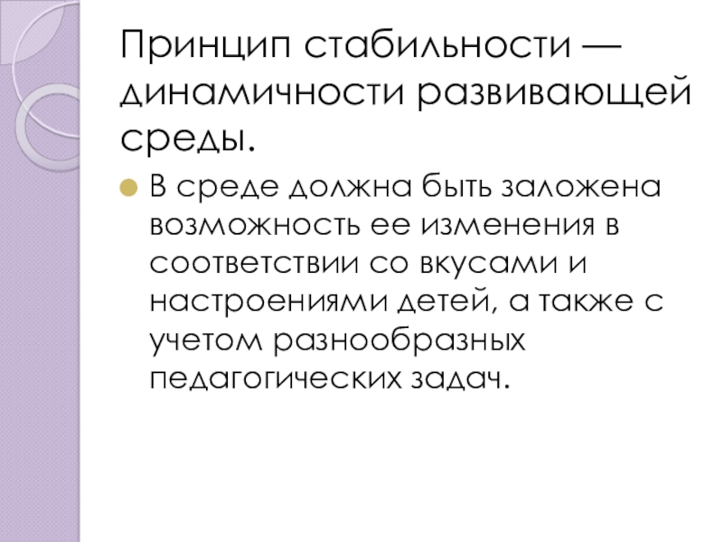 Среда должна пробуждать у детей активность, давать им возможность осуществлять разнообразные виды деятельности, получать радость от них, и вместе с тем окружающая обстановка должна иметь свойства при необходимости «гасить» такую активность, давать возможность отдохнуть.