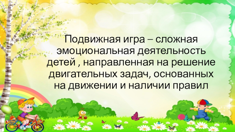 Слайд 3Подвижная игра – сложная эмоциональная деятельность детей , направленная на решение