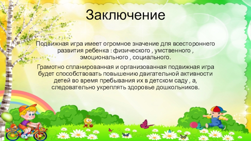 Грамотно спланированная и организованная подвижная игра будет способствовать повышению двигательной активности детей во время пребывания их в детском саду , а, следовательно укреплять здоровье дошкольников.