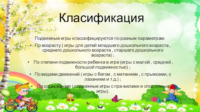 По содержанию ( подвижные игры с пра-вилами и спортивные игры).