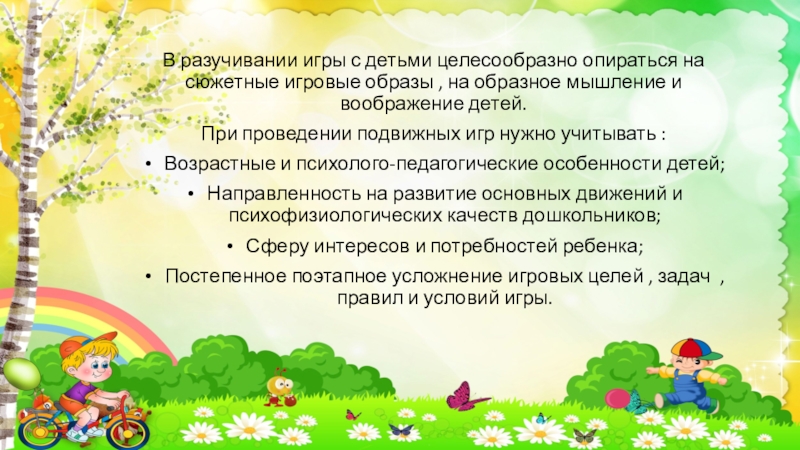 Слайд 8В разучивании игры с детьми целесообразно опираться на сюжетные игровые образы
