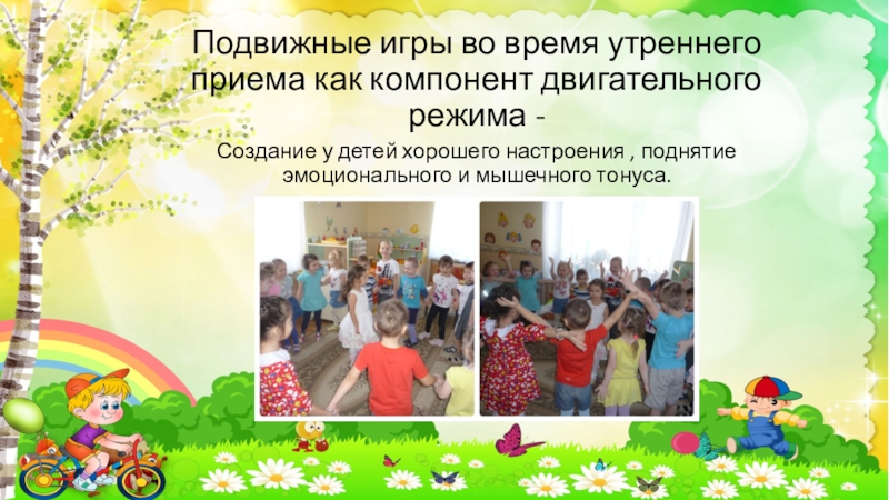 Слайд 10Подвижные игры во время утреннего приема как компонент двигательного режима -