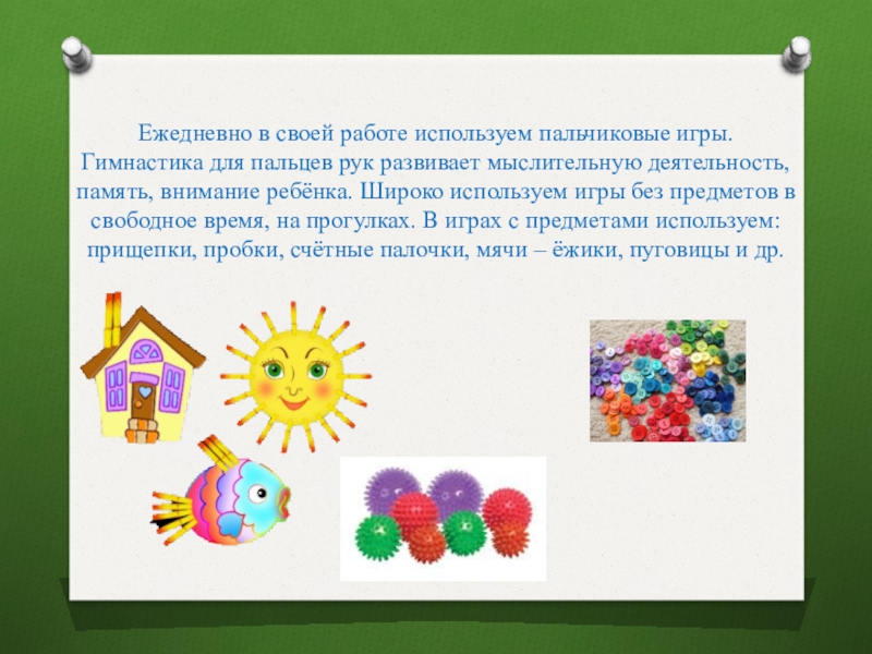 мыслительную деятельность, память, внимание ребёнка. Широко используем игры без предметов в свободное время, на прогулках. В играх с предметами используем: прищепки, пробки, счётные палочки, мячи – ёжики, пуговицы и др.