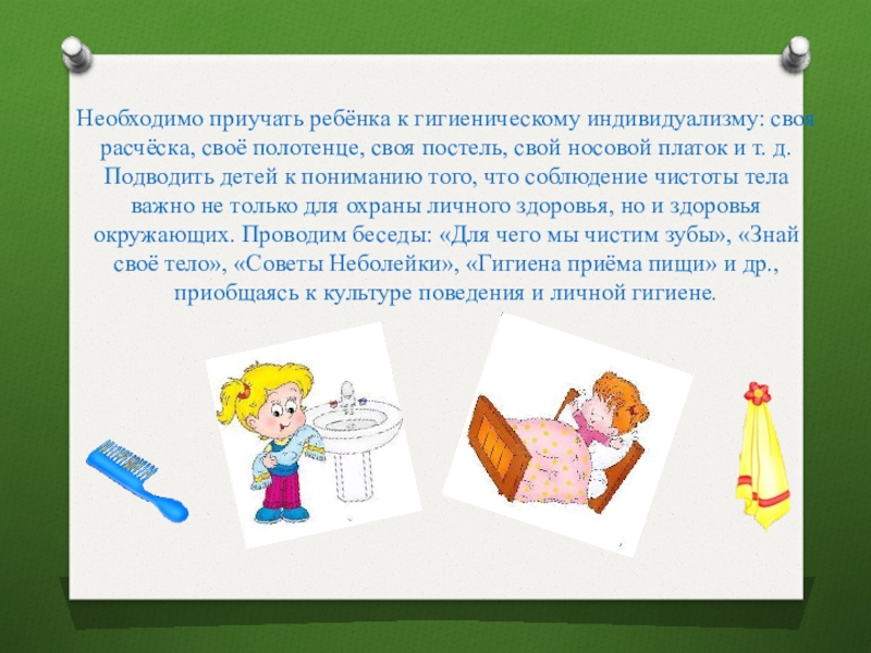 Слайд 11Необходимо приучать ребёнка к гигиеническому индивидуализму: своя расчёска, своё полотенце, своя