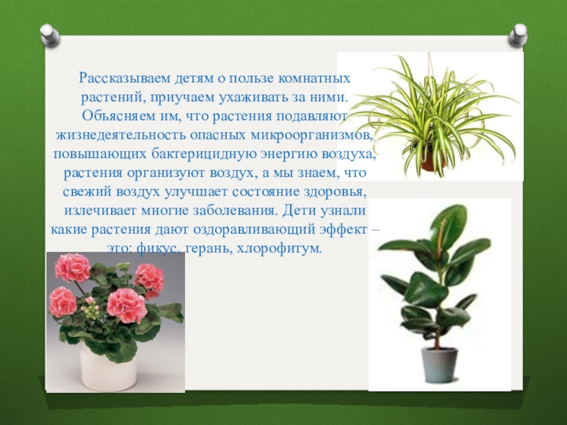 им, что растения подавляют жизнедеятельность опасных микроорганизмов, повышающих бактерицидную энергию воздуха, растения организуют воздух, а мы знаем, что свежий воздух улучшает состояние здоровья, излечивает многие заболевания. Дети узнали какие растения дают оздоравливающий эффект – это: фикус, герань, хлорофитум.