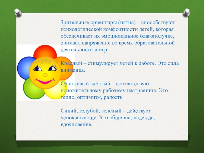 Слайд 9Зрительные ориентиры (пятна) – способствуют психологической комфортности детей, которая обеспечивает их