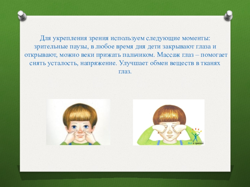 Слайд 8Для укрепления зрения используем следующие моменты: зрительные паузы, в любое время