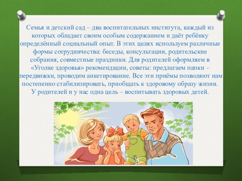 воспитывать у него заинтересованность и активность в саморазвитии и самосохранении, формировать у детей разумное отношение к своему организму, учить вести здоровый образ жизни. Мы работаем в этом направлении только совместно с семьёй, ведь главные воспитатели ребёнка – его родители.