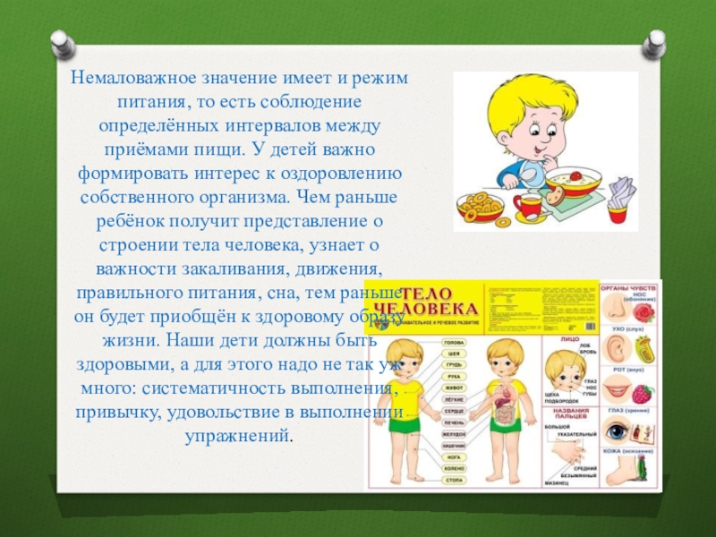 между приёмами пищи. У детей важно формировать интерес к оздоровлению собственного организма. Чем раньше ребёнок получит представление о строении тела человека, узнает о важности закаливания, движения, правильного питания, сна, тем раньше он будет приобщён к здоровому образу жизни. Наши дети должны быть здоровыми, а для этого надо не так уж много: систематичность выполнения, привычку, удовольствие в выполнении упражнений.